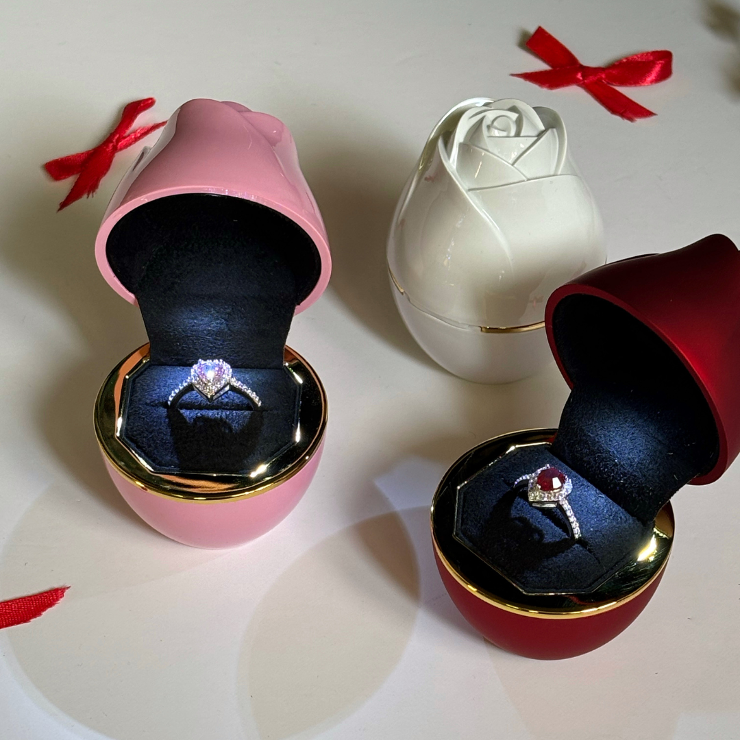 The Glow Bloom is a beautifully designed rose box with a built-in light that shines directly on the surprise inside.